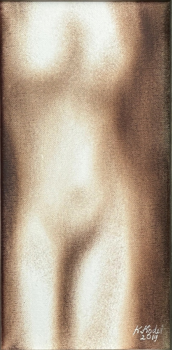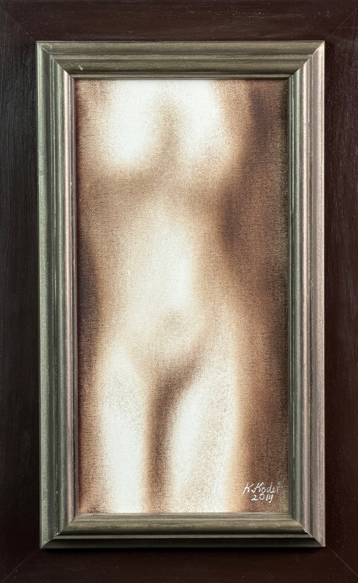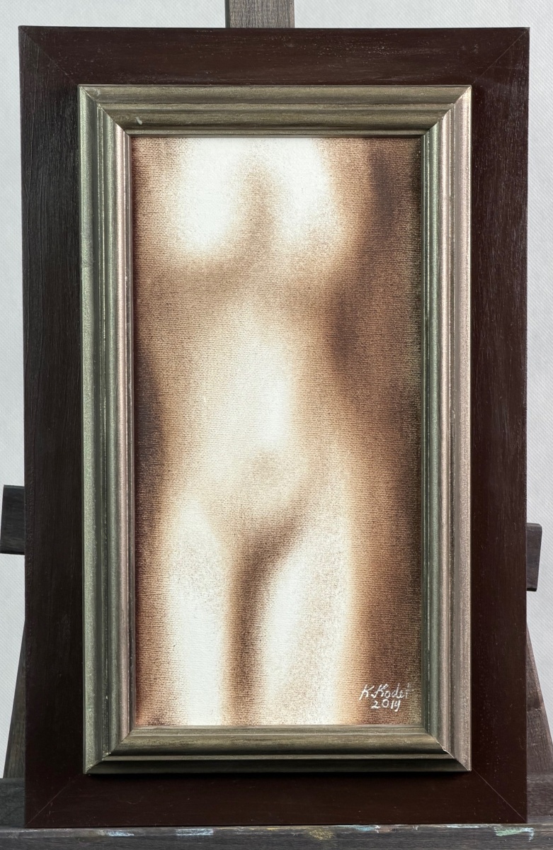 Obraz Spanilá z roku 2019 představuje Kristiana Kodeta v jedné z jeho nejčistších poloh – v okamžiku, kdy se malíř vzdává všech zbytečností a ponechává divákovi ryzí, téměř meditativní studii ženského torza. Ačkoliv má samotná malba komorní formát 30 × 15 cm, působí díky precizně vedené světelné modelaci mnohem větším dojmem. Jemně rozptýlené tóny hnědí a okrů se vynořují z mlžného pozadí a nechávají siluetu těla téměř levitovat v prostoru. Tento optický efekt je typickým projevem Kodetova mistrovství: jednoduchost, která není prostá, ale očištěná až k podstatě.
